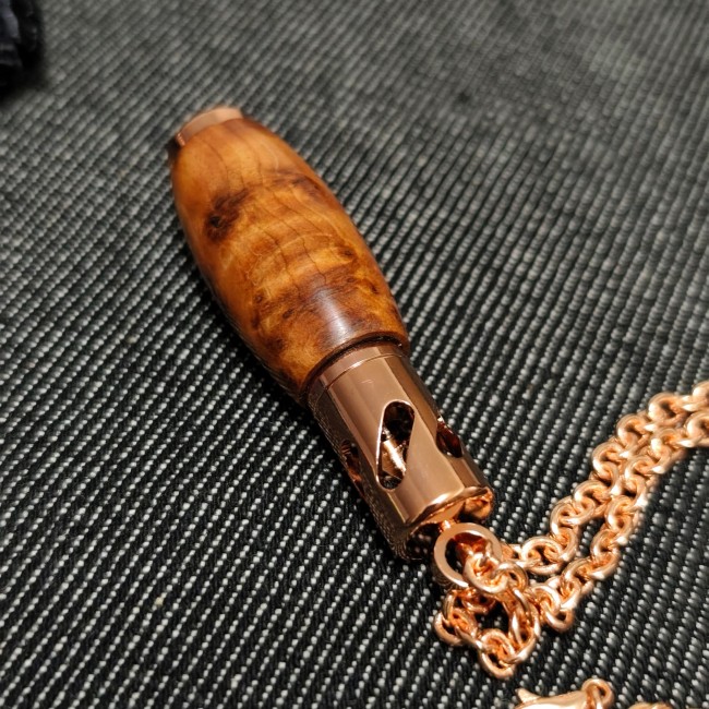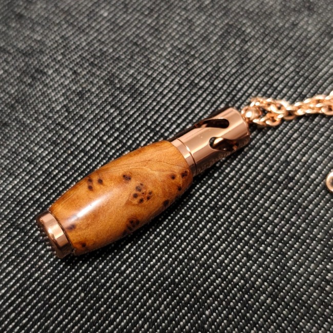 Ce modèle est en Loupe de Thuya, magnifique bois originaire du Maroc (considéré comme "l'or des ébénistes d' Esouaouira") au veinage délicat et aux motifs naturels en peau de léopard ou en flammèches. C'est un bois très dur, très veiné, au toucher soyeux. Un de mes préférés.