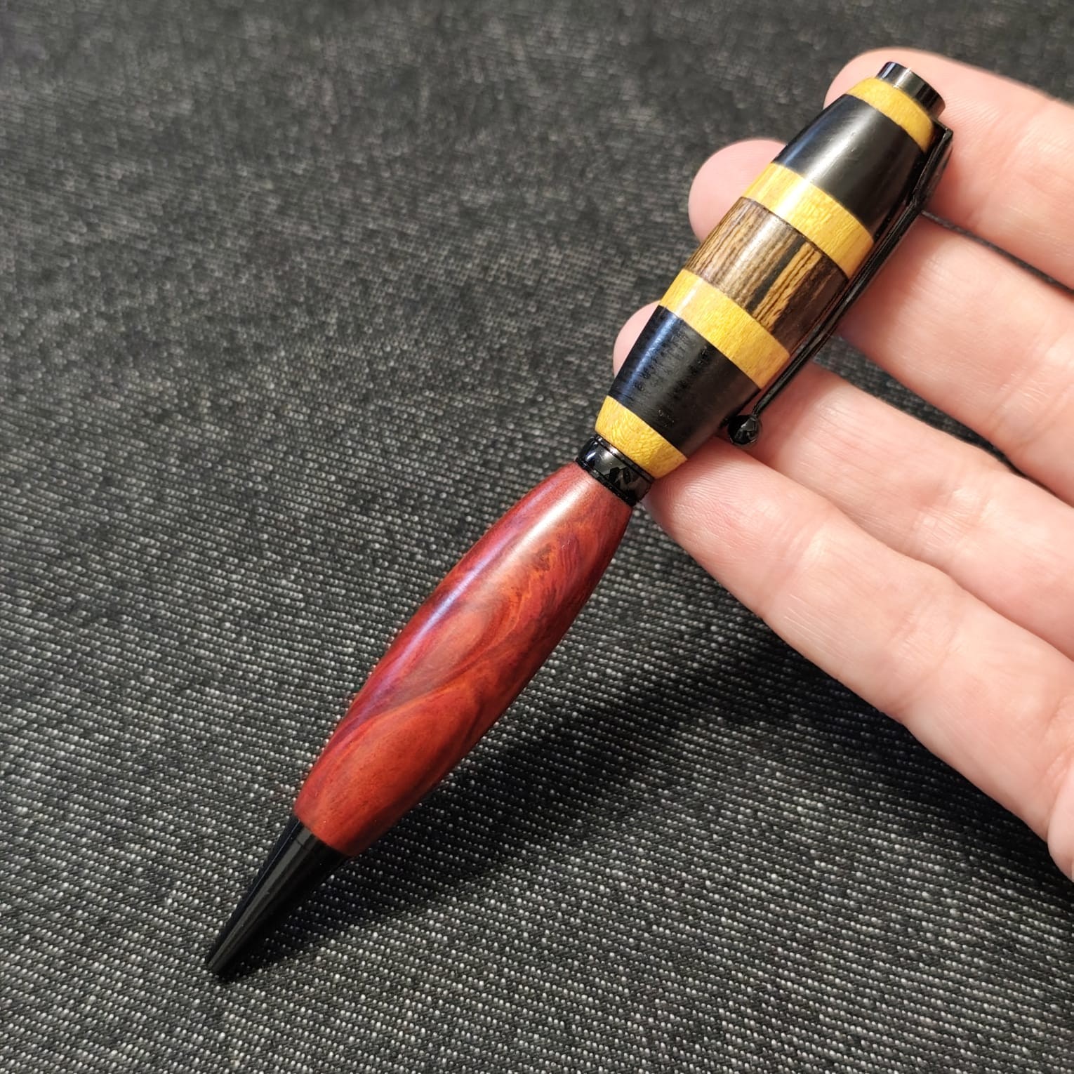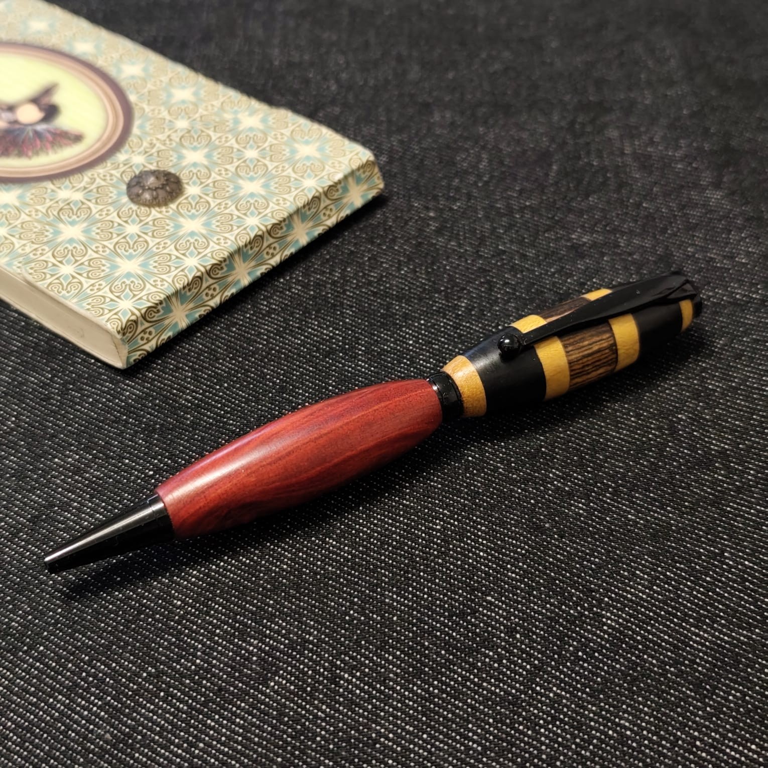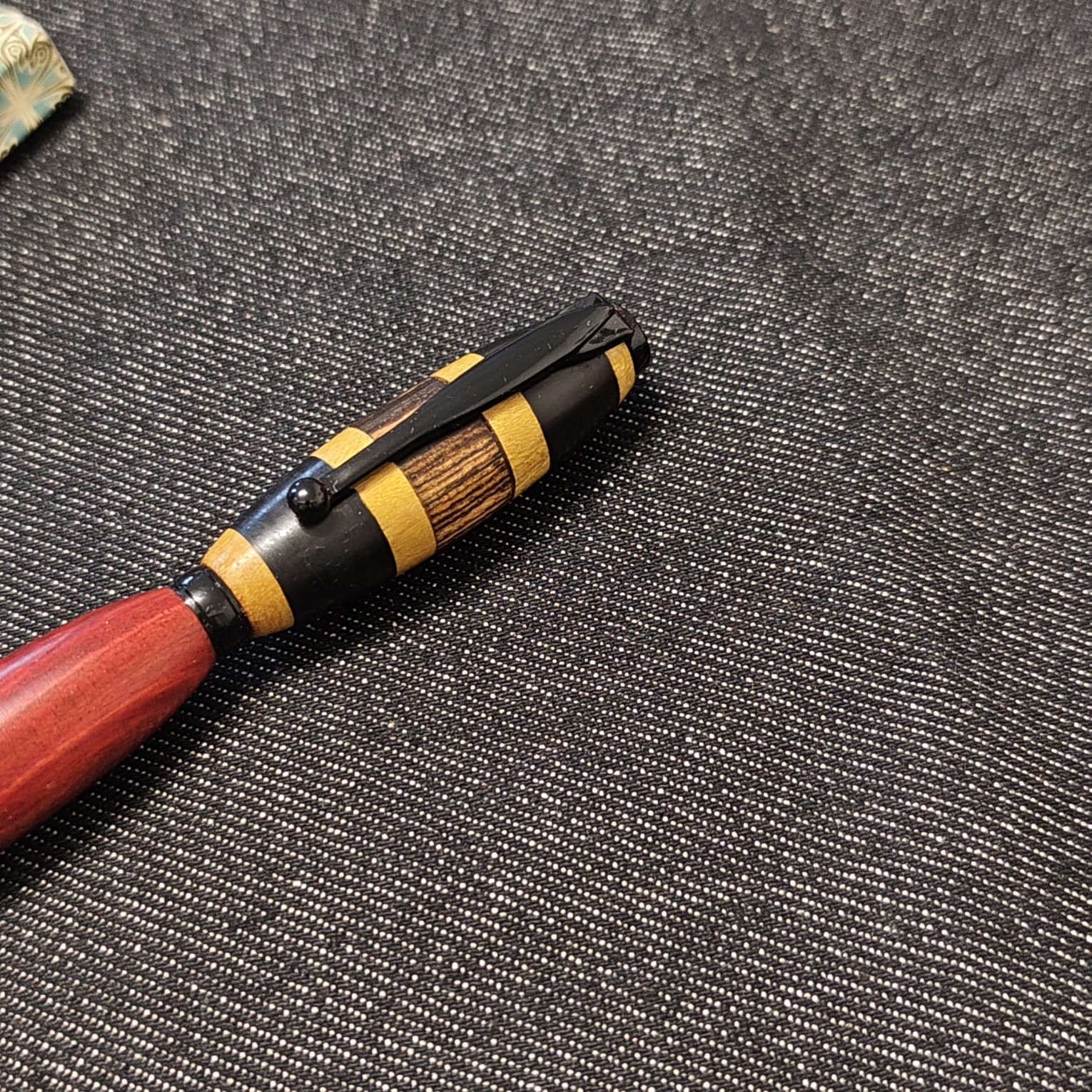 Je vous présente ici un beau stylo en bois dans notre collection Arlequin. Il est composé de différentes essences de bois: Padouk, Ébène, Oranger des Osages et Wacapou. Un élègant accessoire d'écriture au graphisme affirmé avec la partie haute à motif rayures et les beaux veinages du bois.