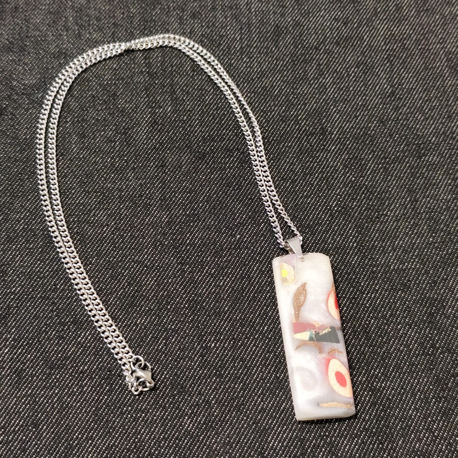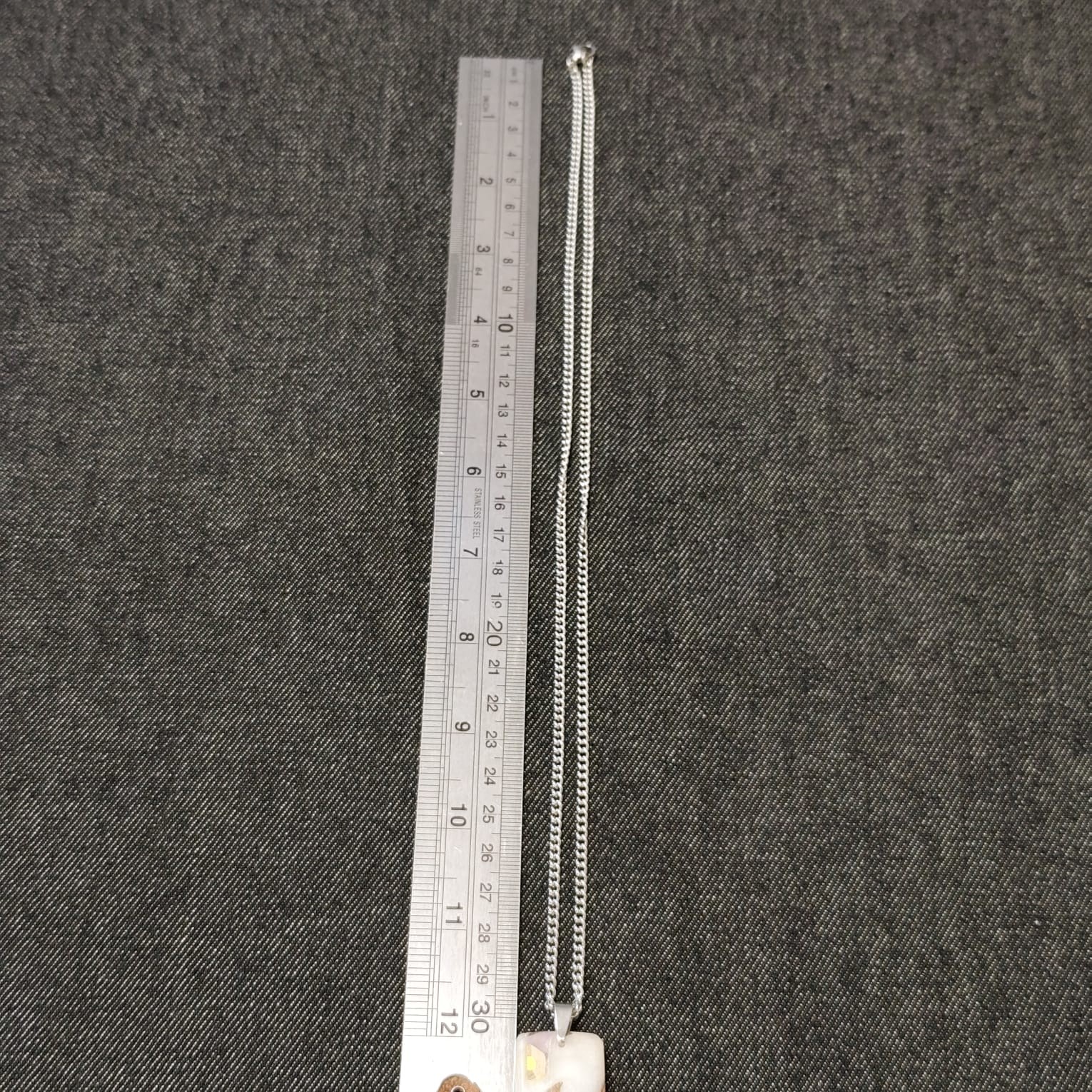 Il fait 5,7 cm de hauteur, 2 cm de largeur et 5 mm d'épaisseur. La chaîne en acier inoxydable fait 30 cm de hauteur ( voir photos ).