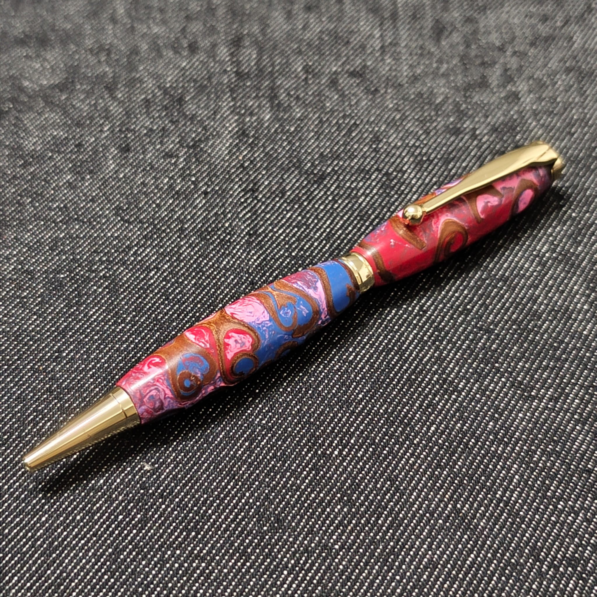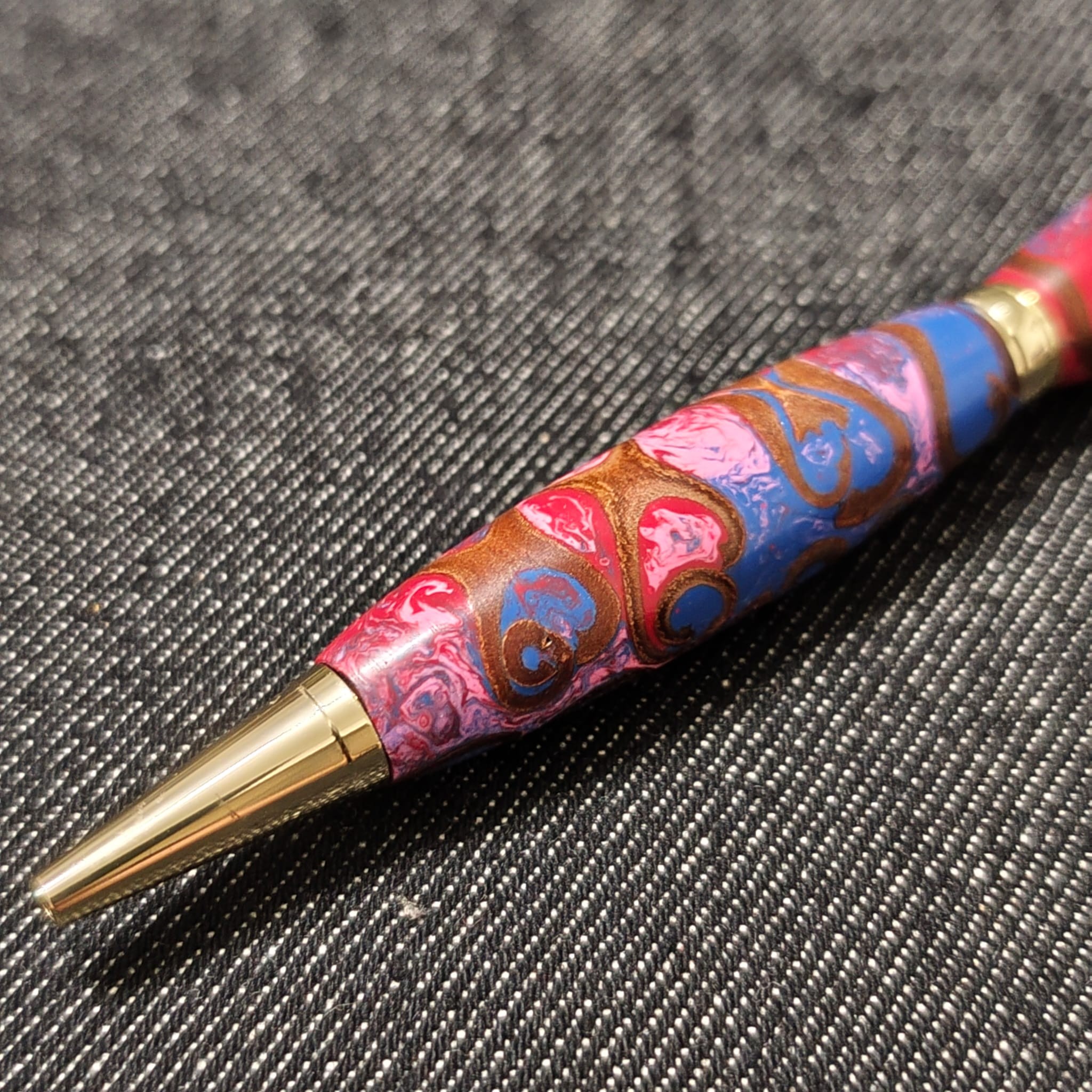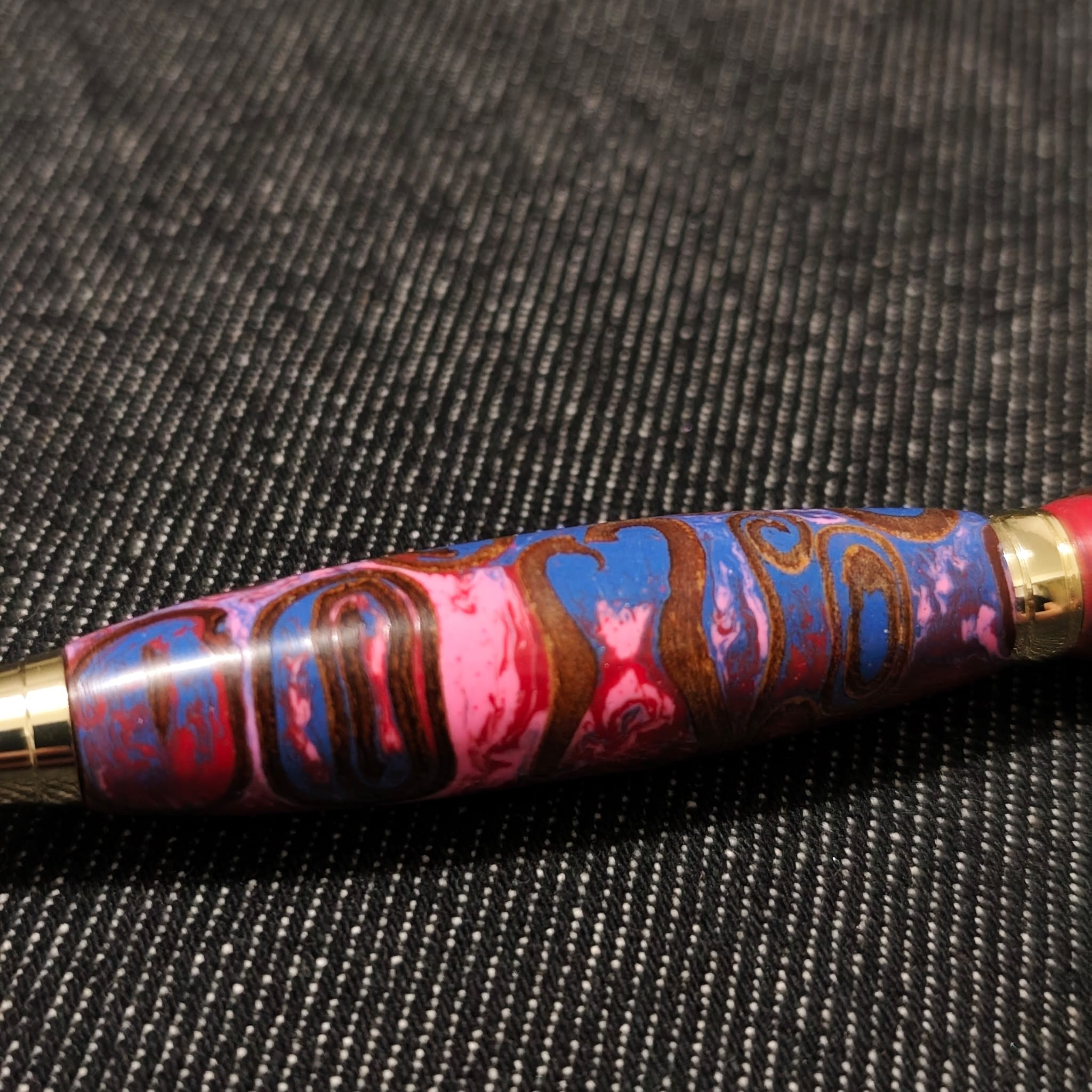 Je vous présente ici un beau stylo au graphisme affirmé, en cannelle et résine multicolore ( rose, bleu et rouge ).