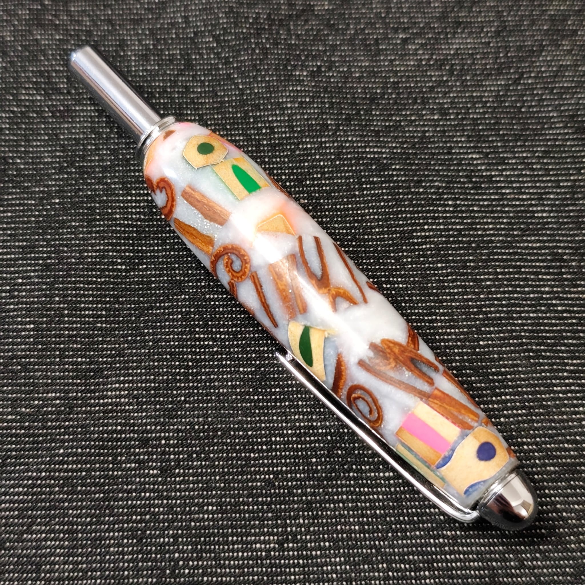 Ce modèle est en cannelle, chutes de crayons de couleurs et résine blanche pailletée tirant vers le gris très clair.