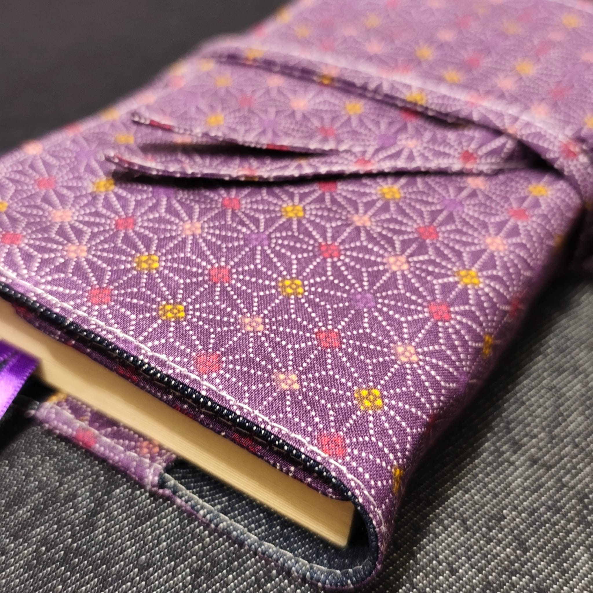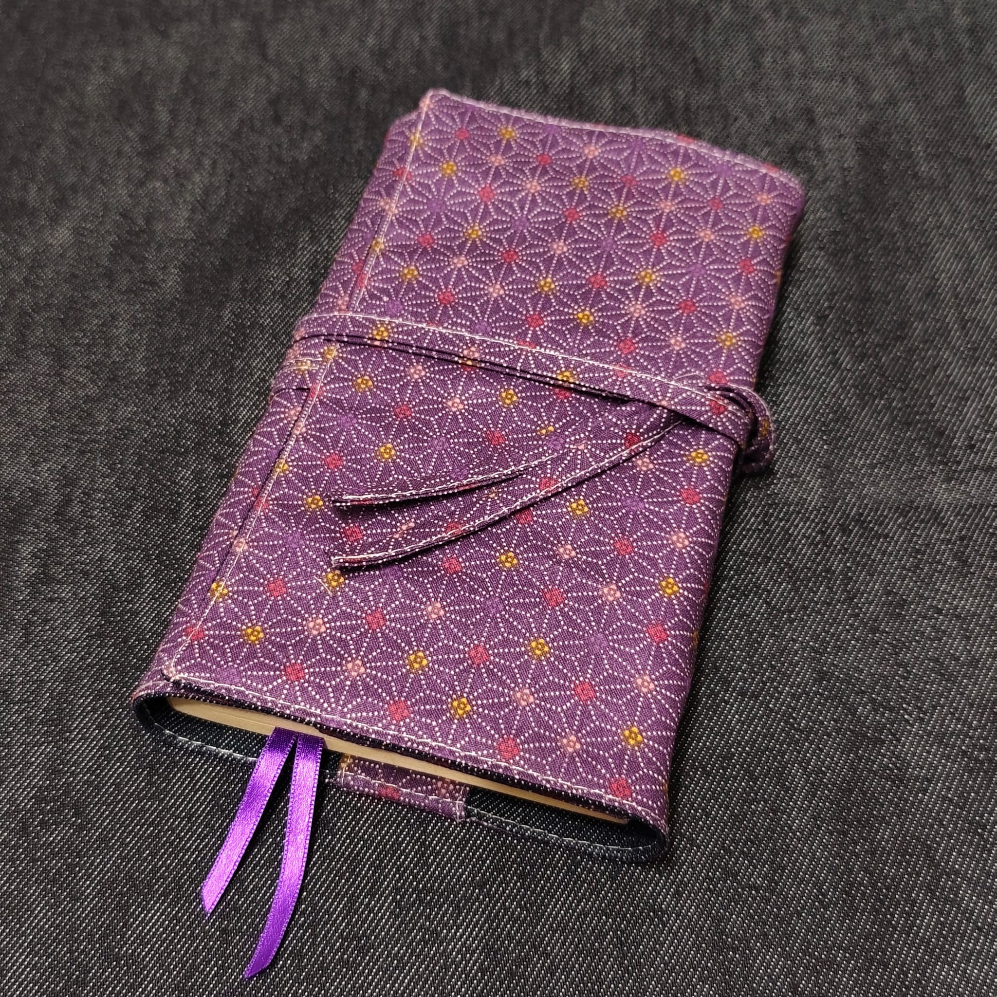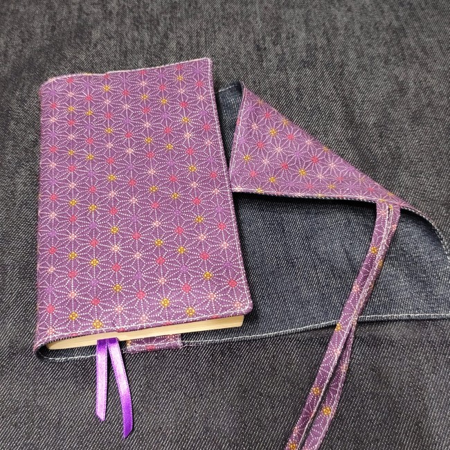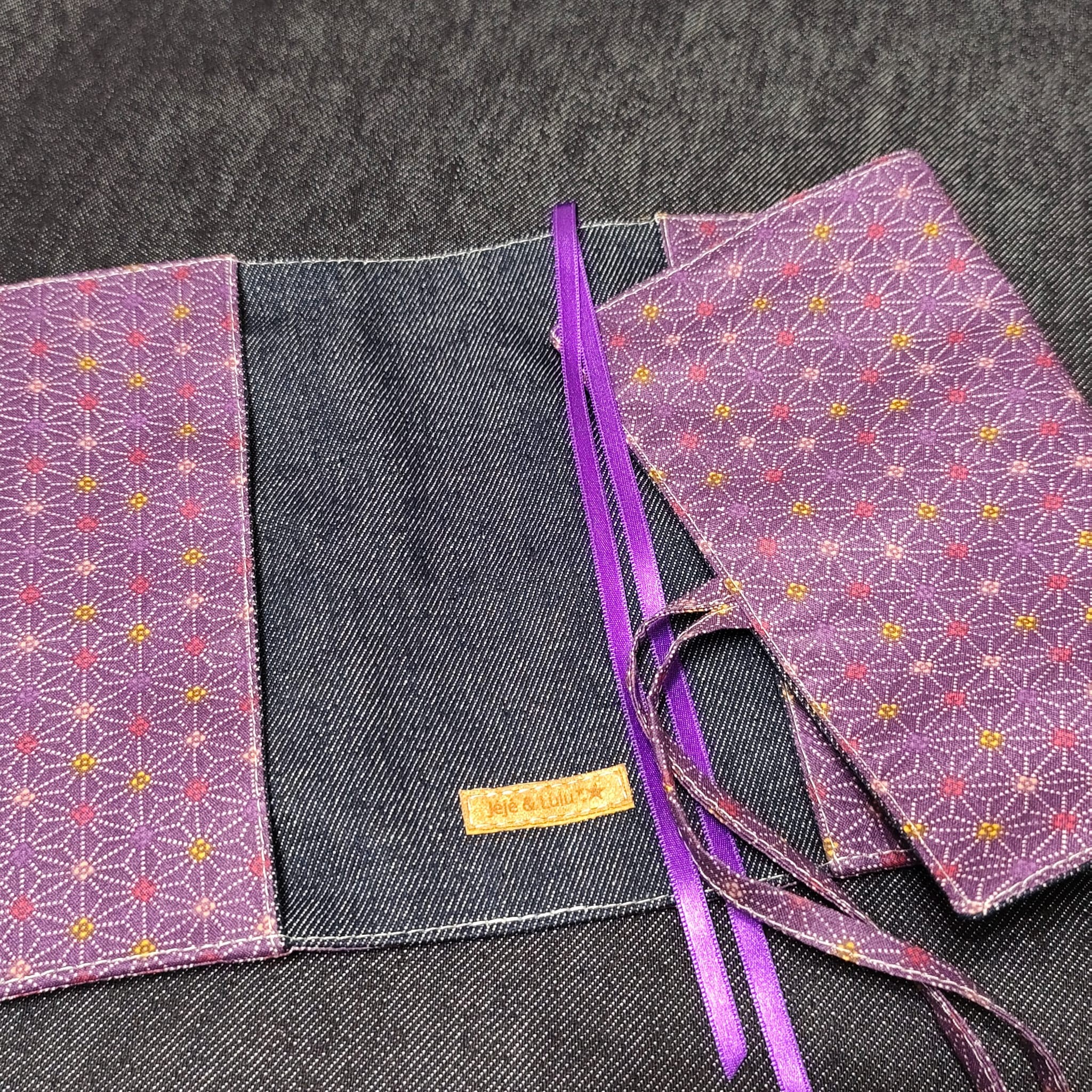 - 2 liens en tissu assorti, choisis comme système de fermeture car ces couvres livres s'adaptent à différentes épaisseurs . J'utilise aussi 2 rubans satin violet pour le système de marques pages intégrés.