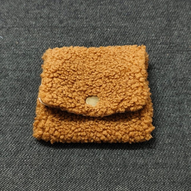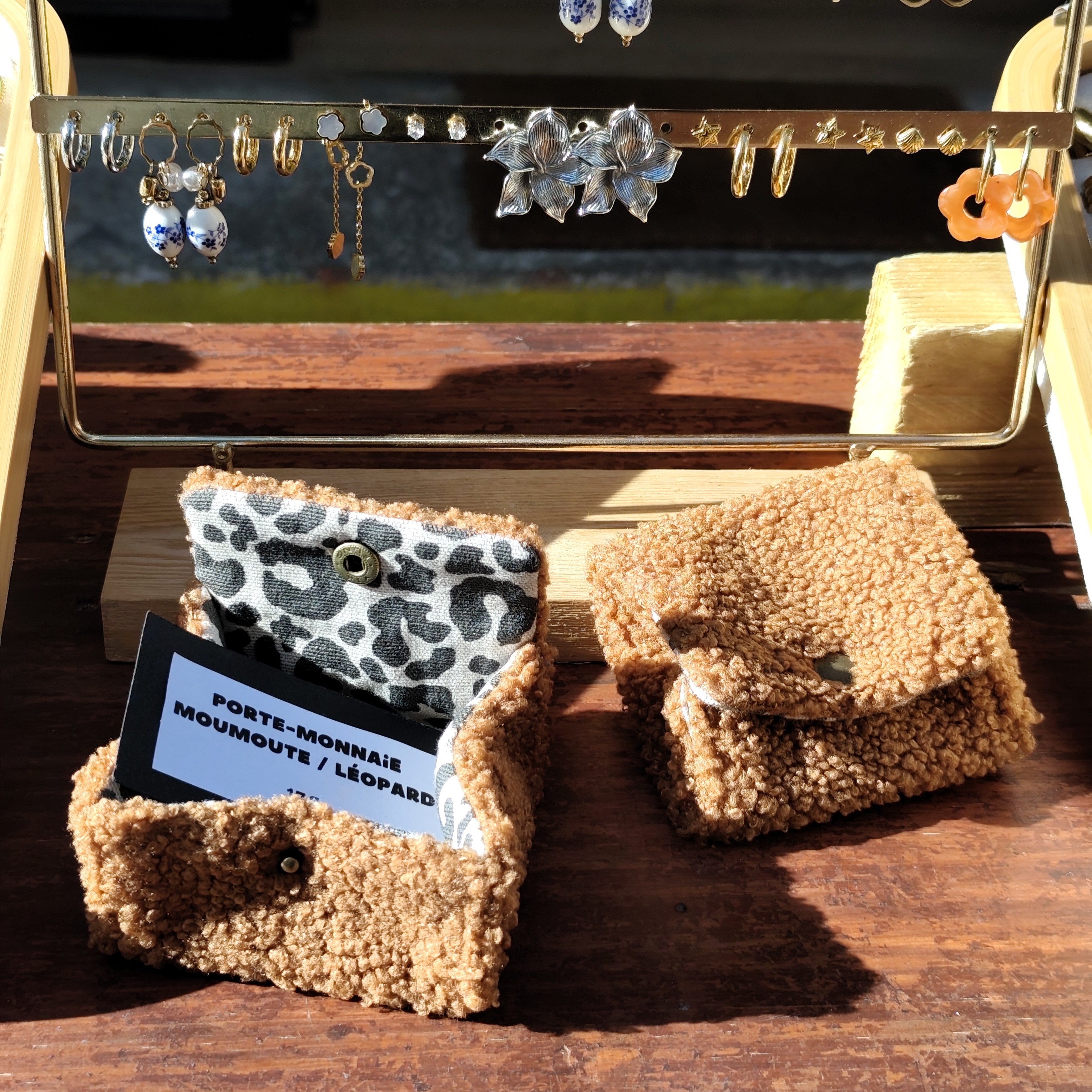 Je vous présente ici un élégant porte-monnaie en moumoute marron et tissu léopard.