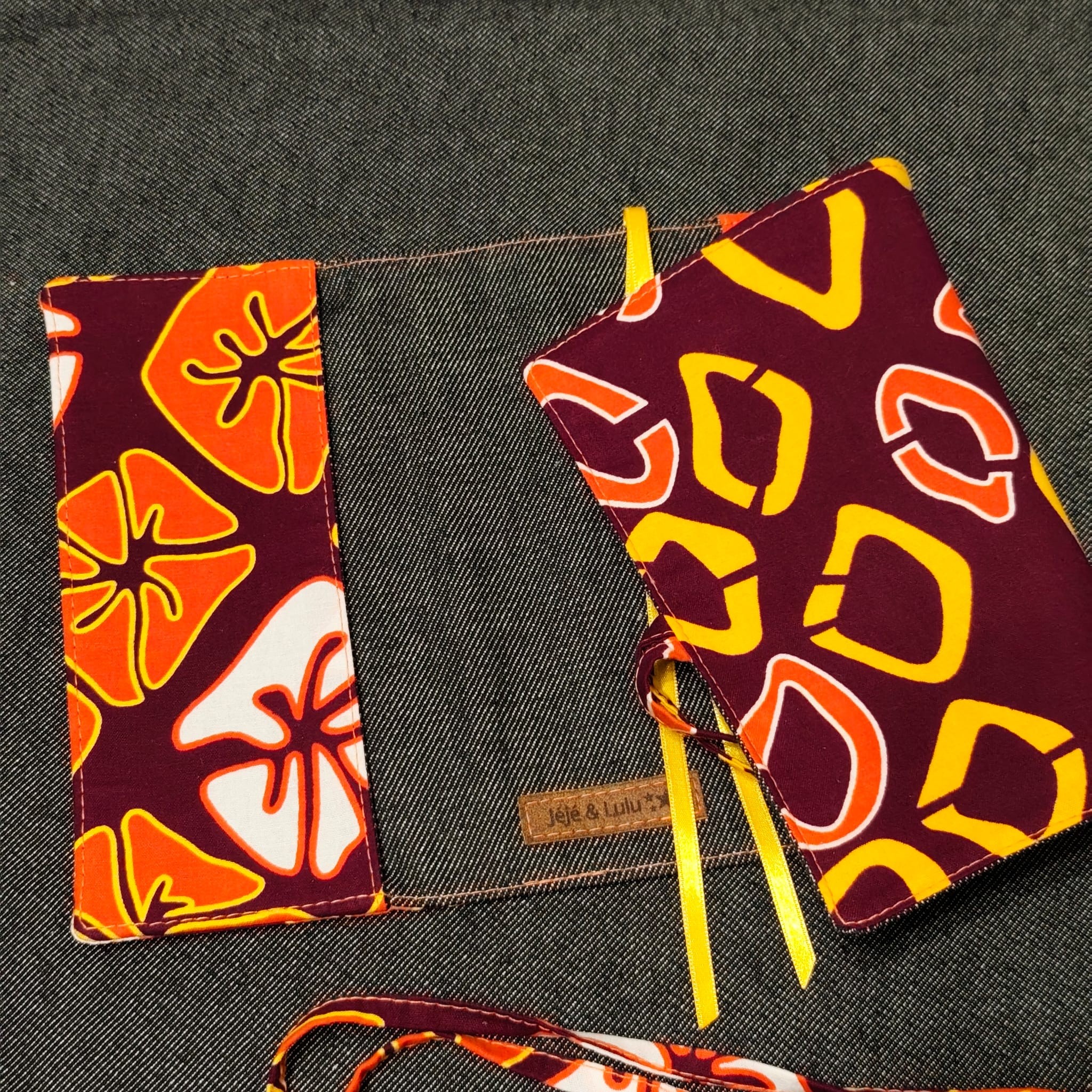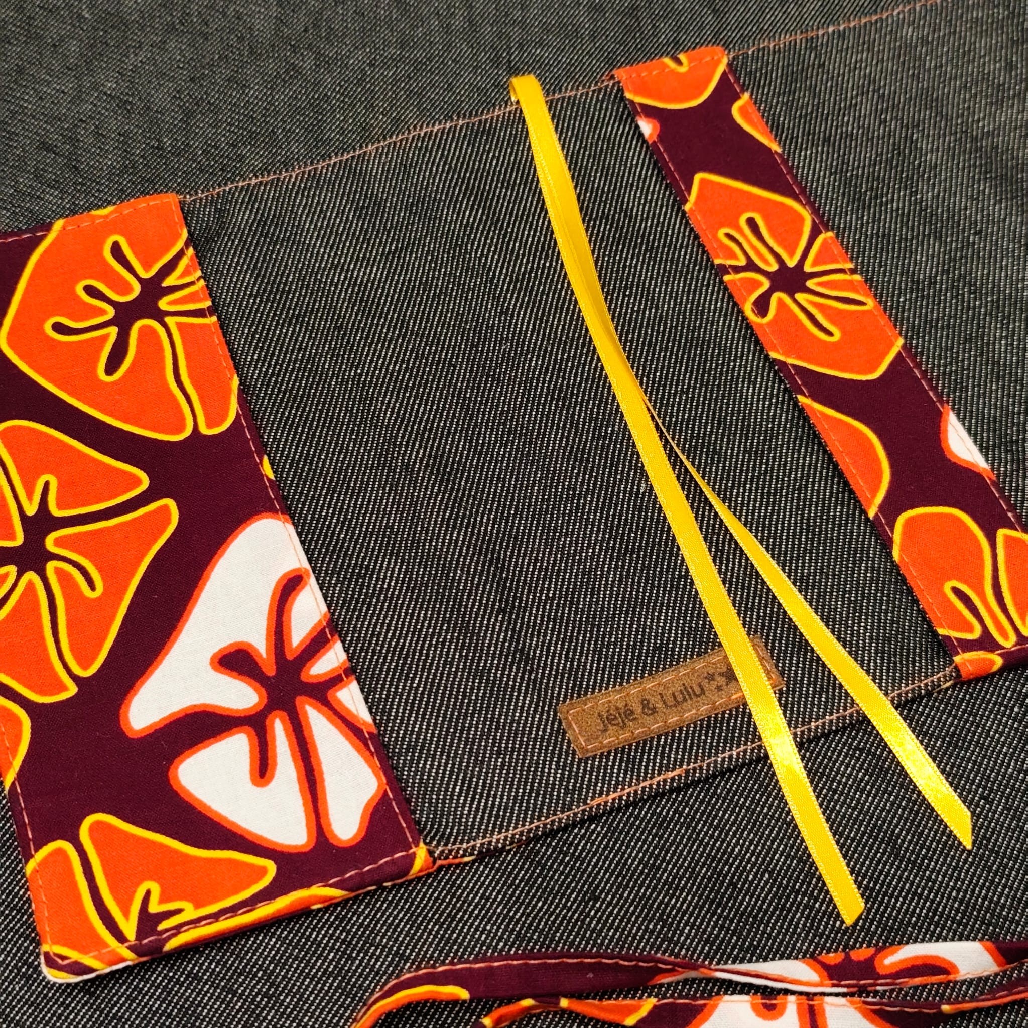 - 2 liens en tissu assorti, choisis comme système de fermeture car ces couvres livres s'adaptent à différentes épaisseurs . J'utilise aussi 2 rubans satin jaunes pour le système de marques pages intégrés.