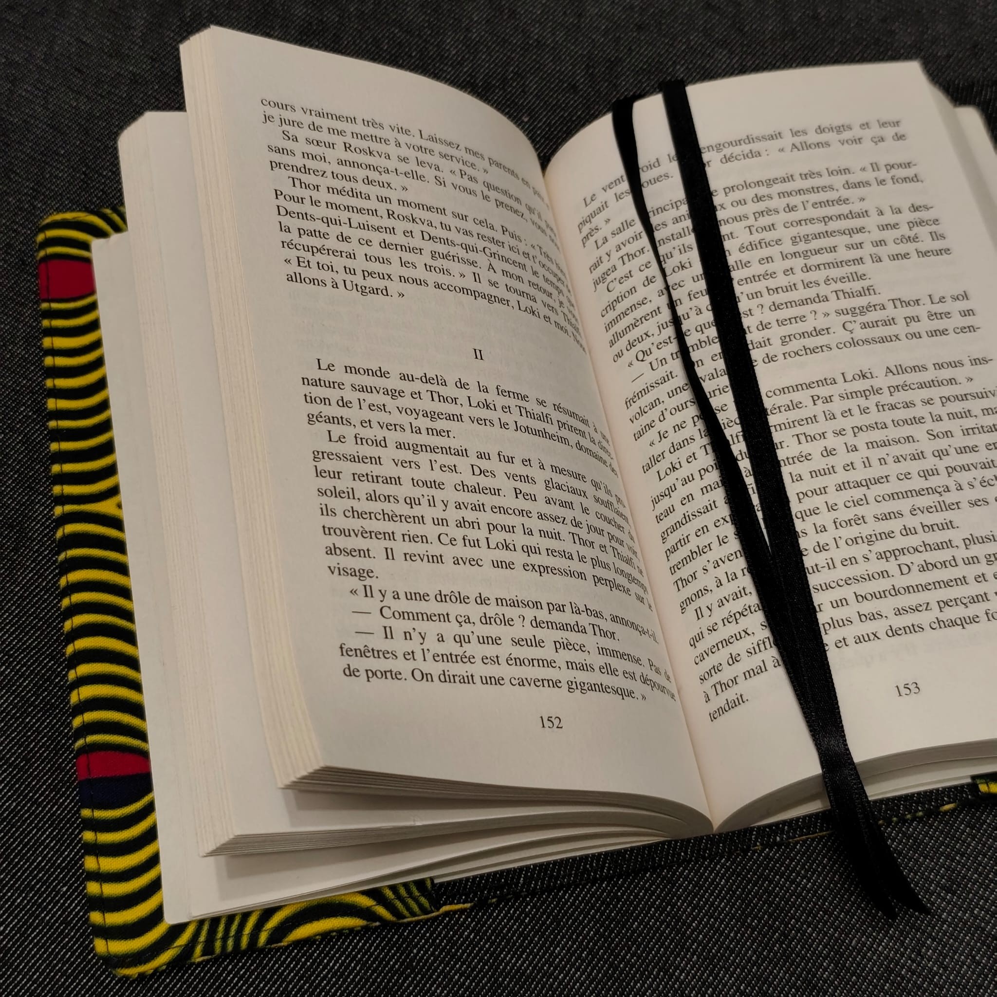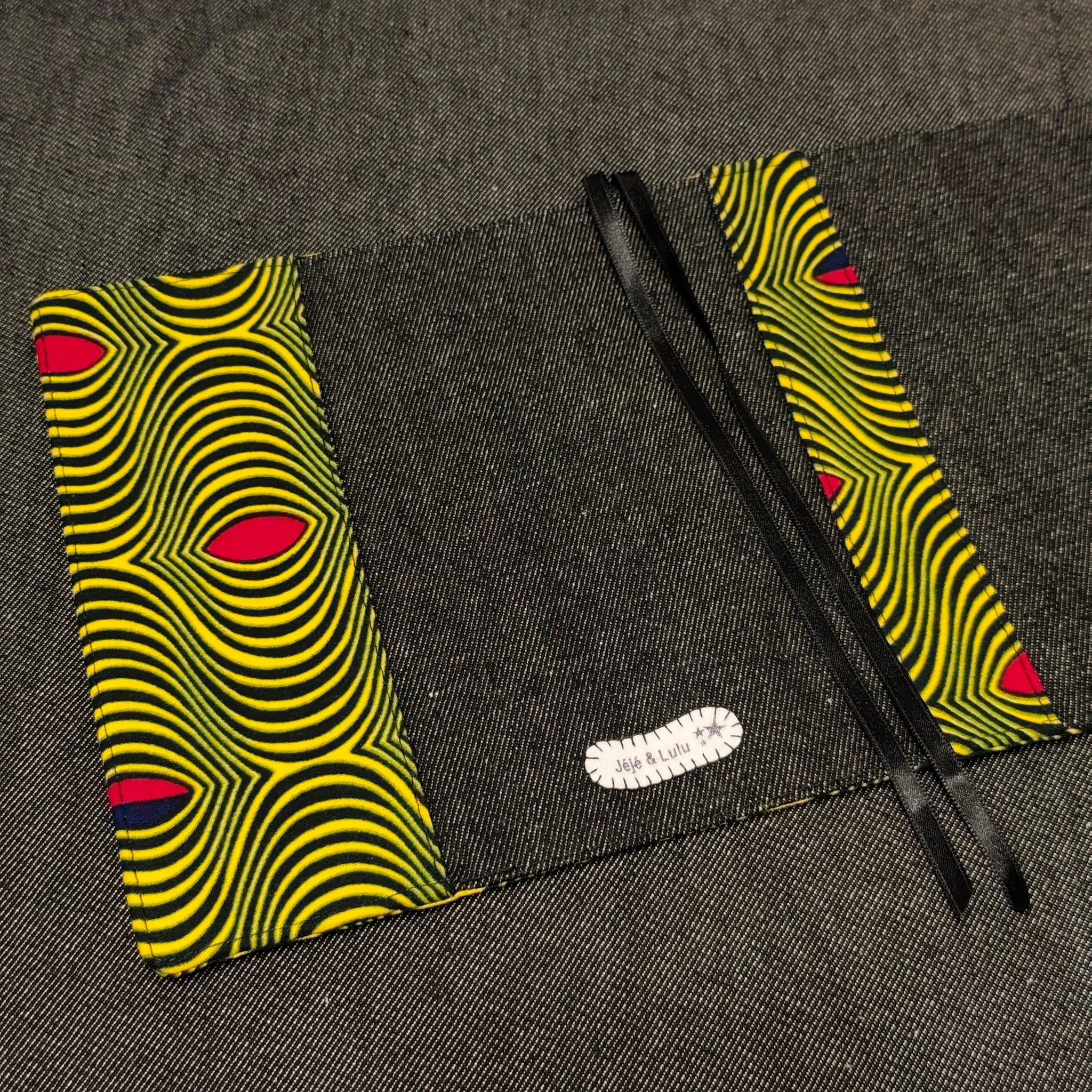 - 2 liens en tissu assorti, choisis comme système de fermeture car ces couvres livres s'adaptent à différentes épaisseurs . J'utilise aussi 2 rubans satin noirs pour le système de marques pages intégrés.