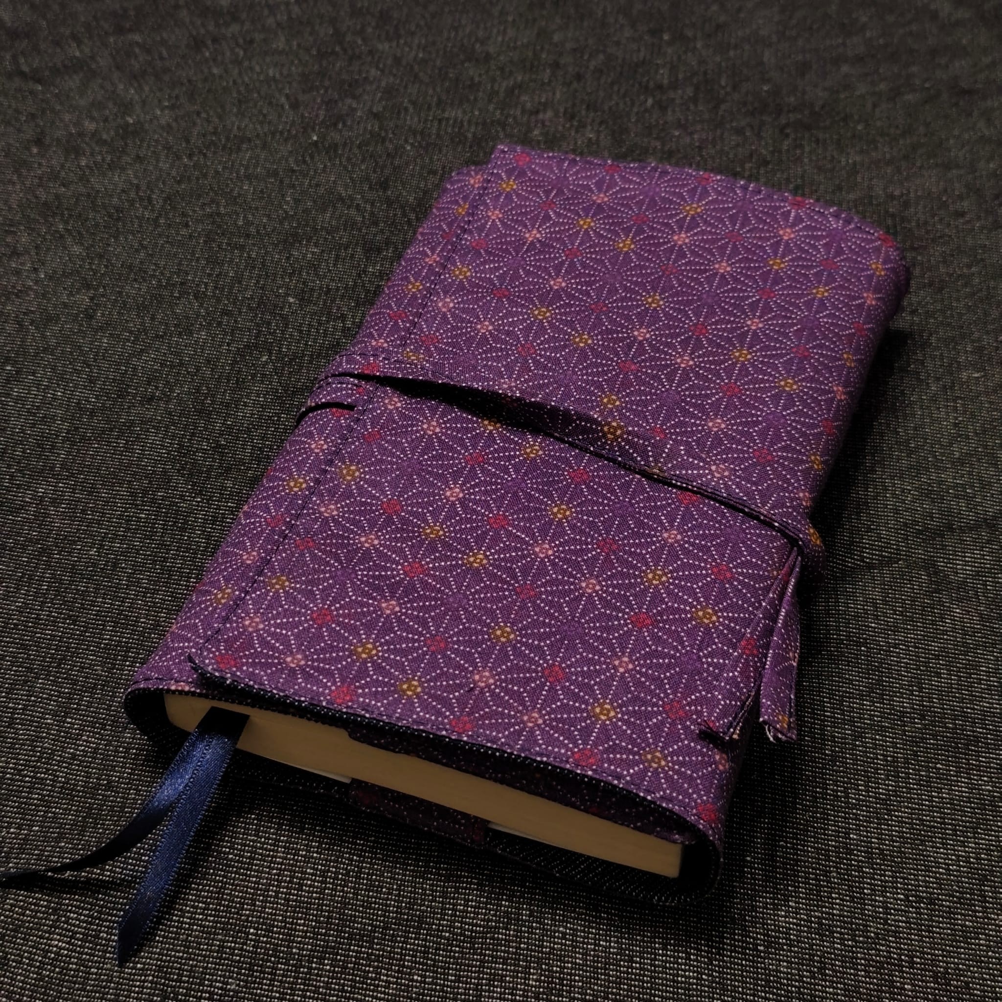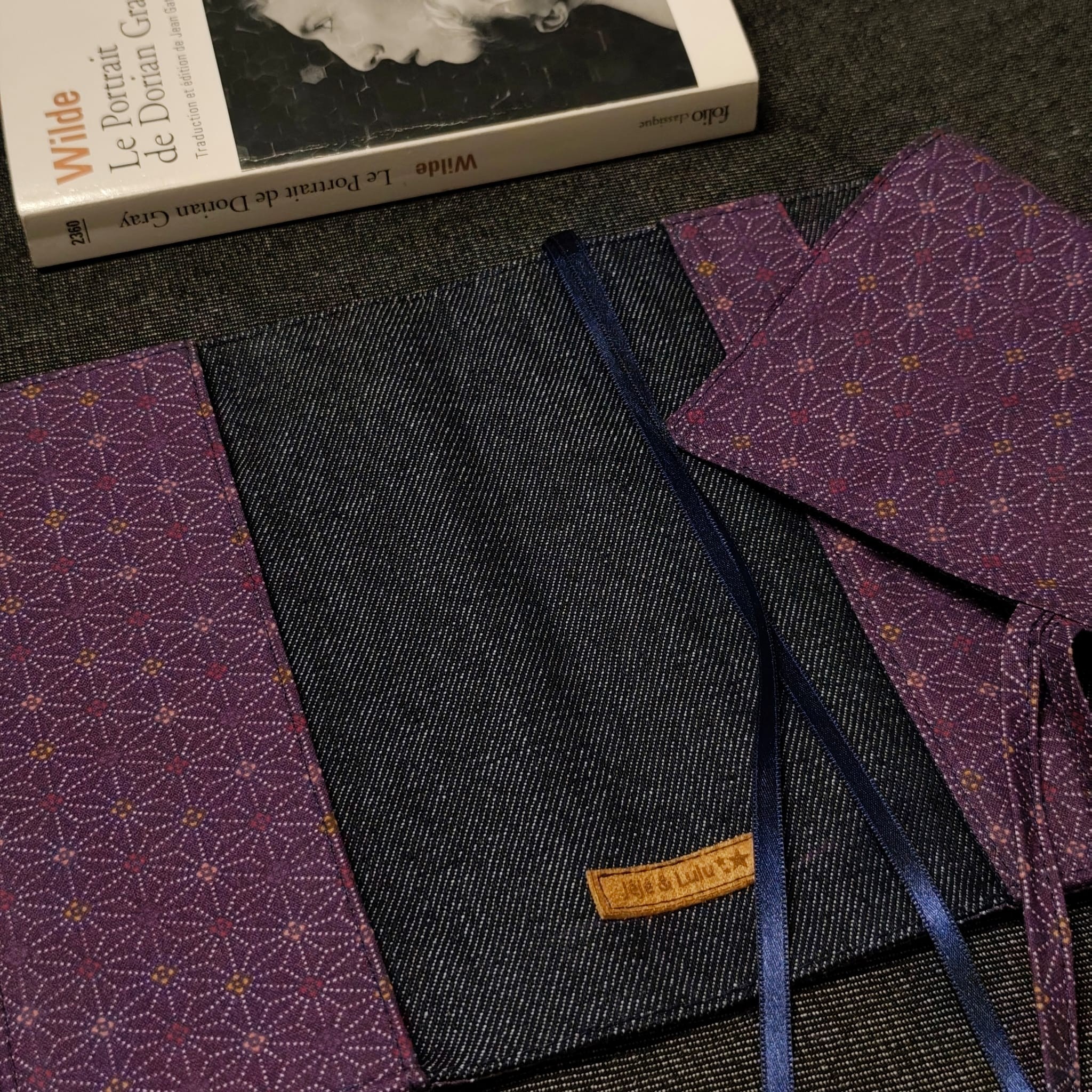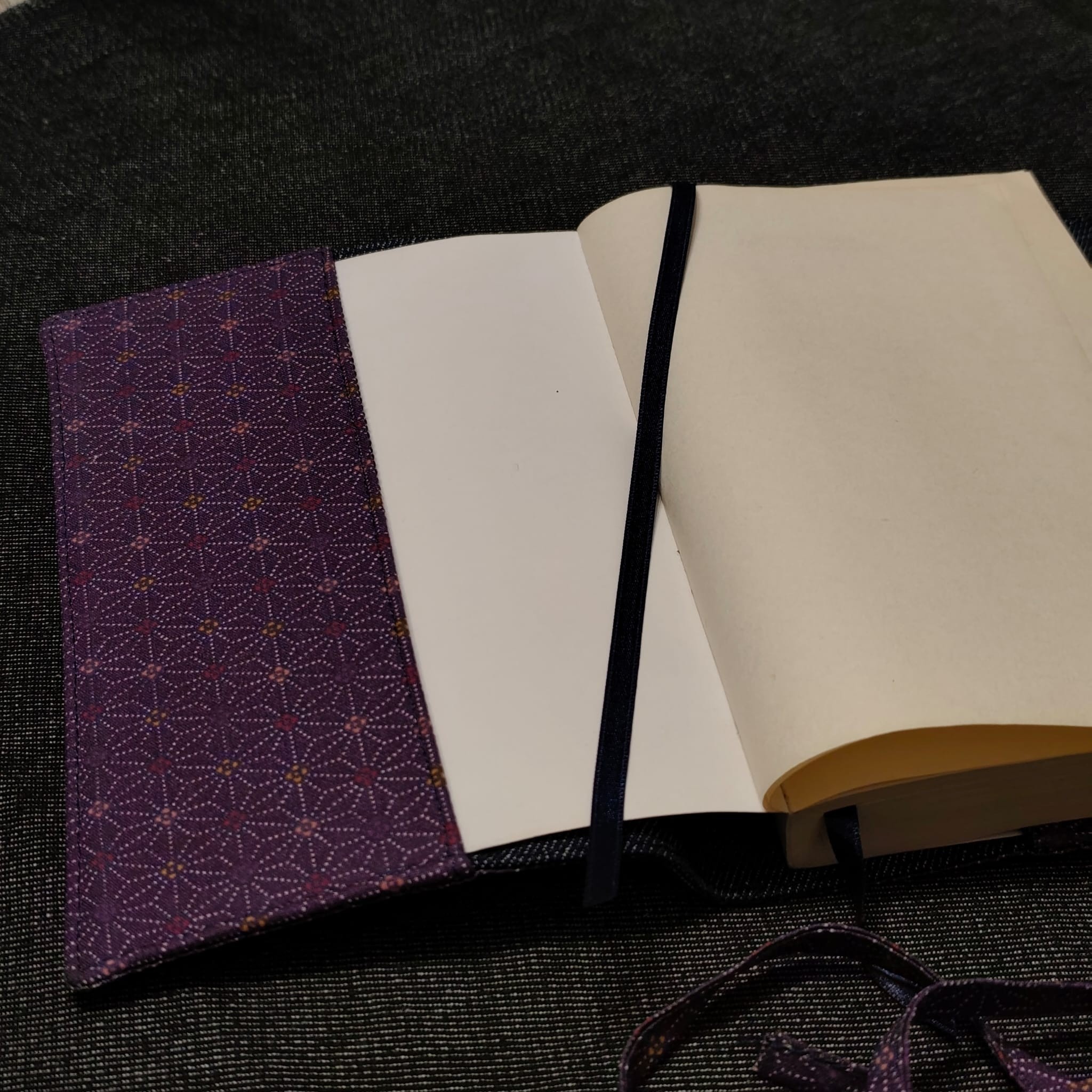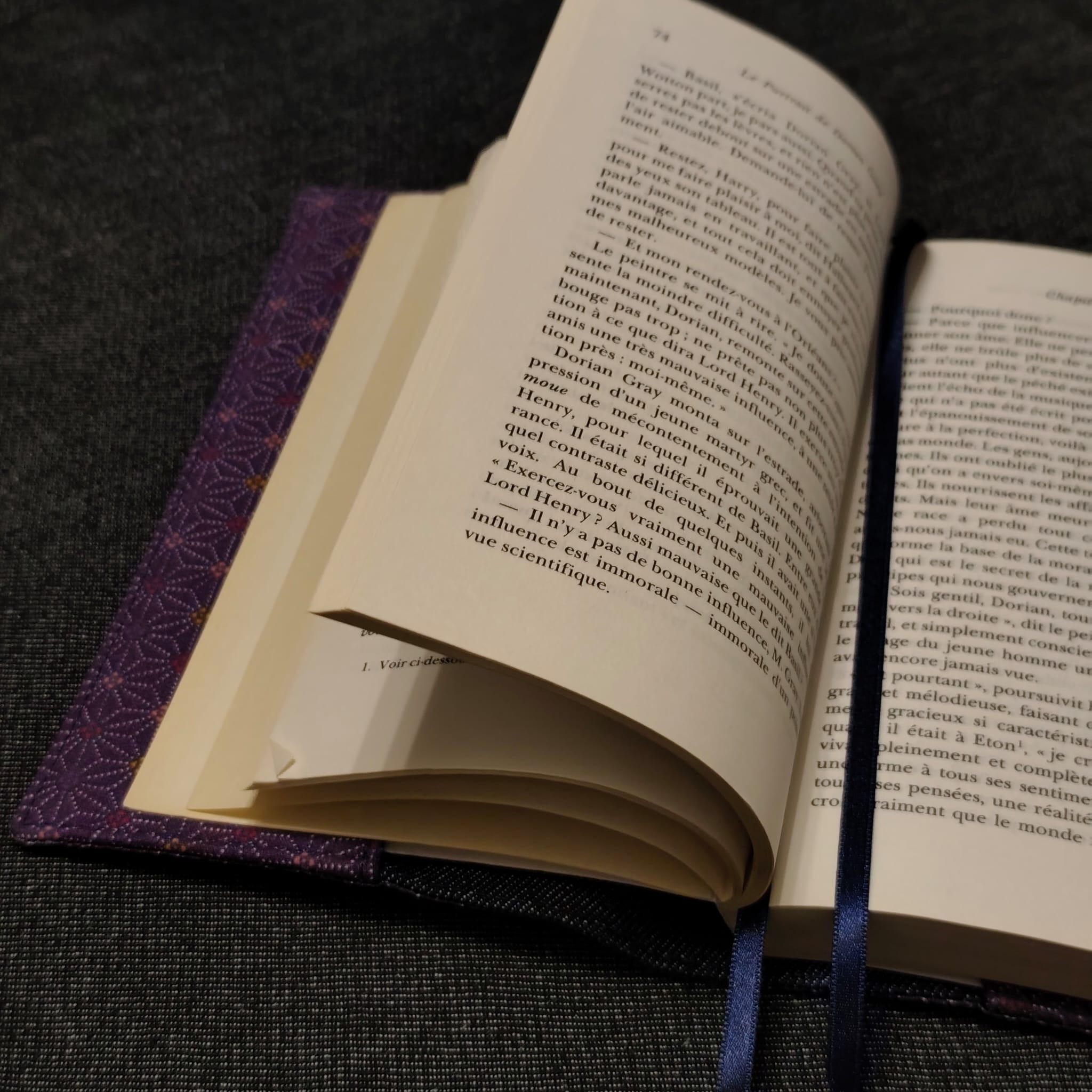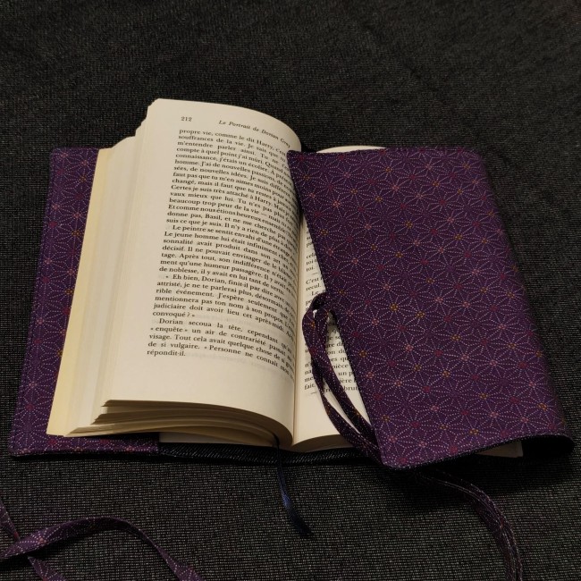 - 2 liens en tissu assorti, choisis comme système de fermeture car ces couvres livres s'adaptent à différentes épaisseurs . J'utilise aussi 2 rubans satin violet pour le système de marques pages intégrés.