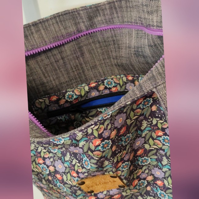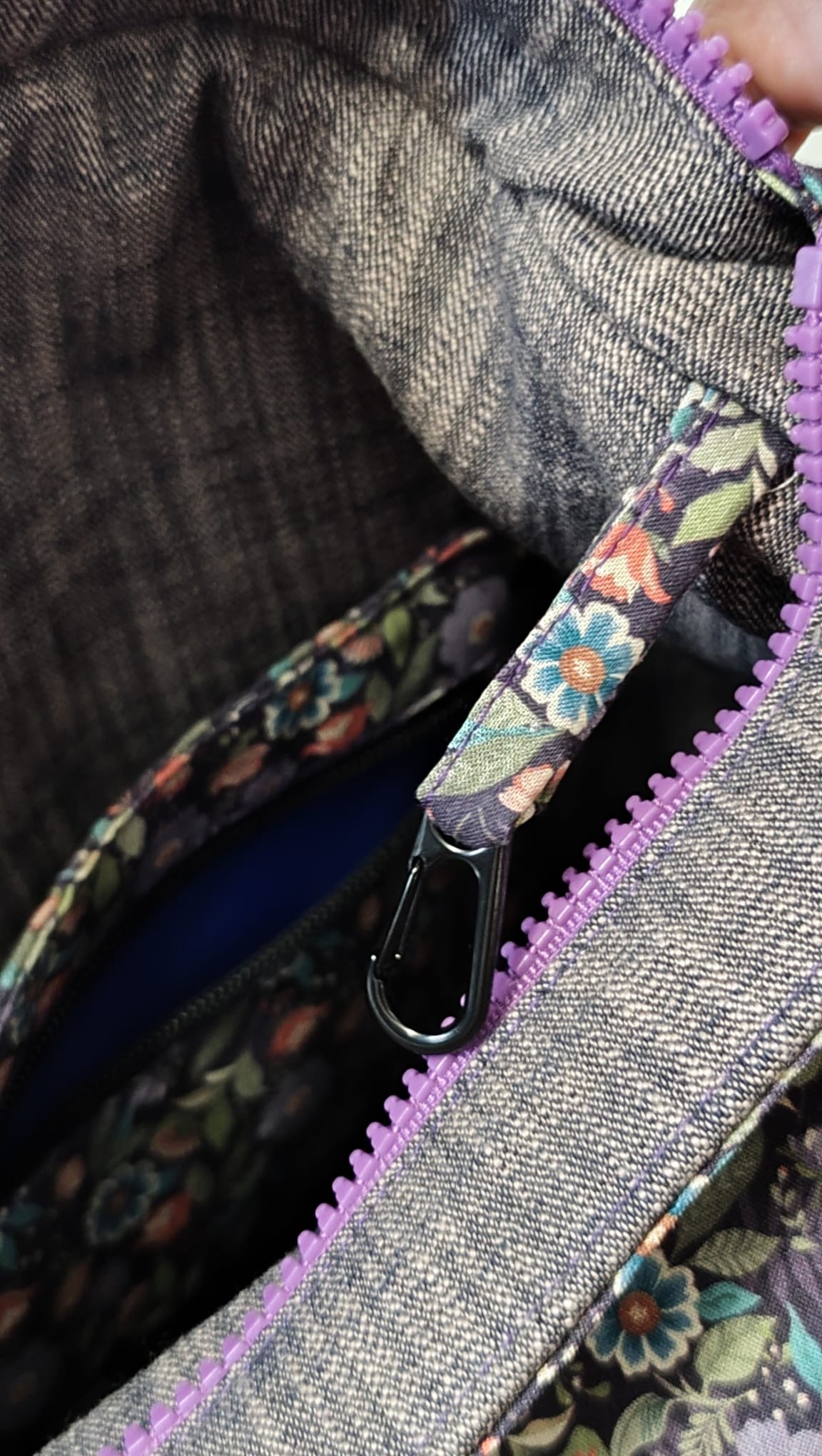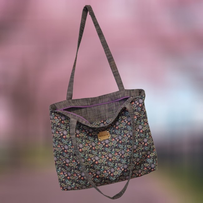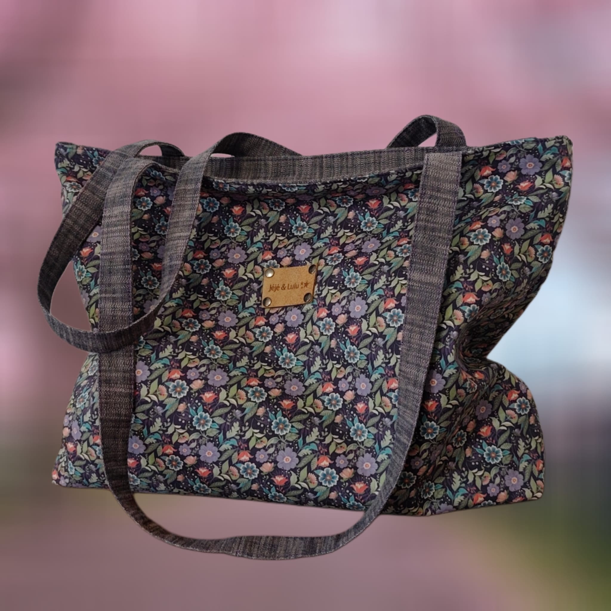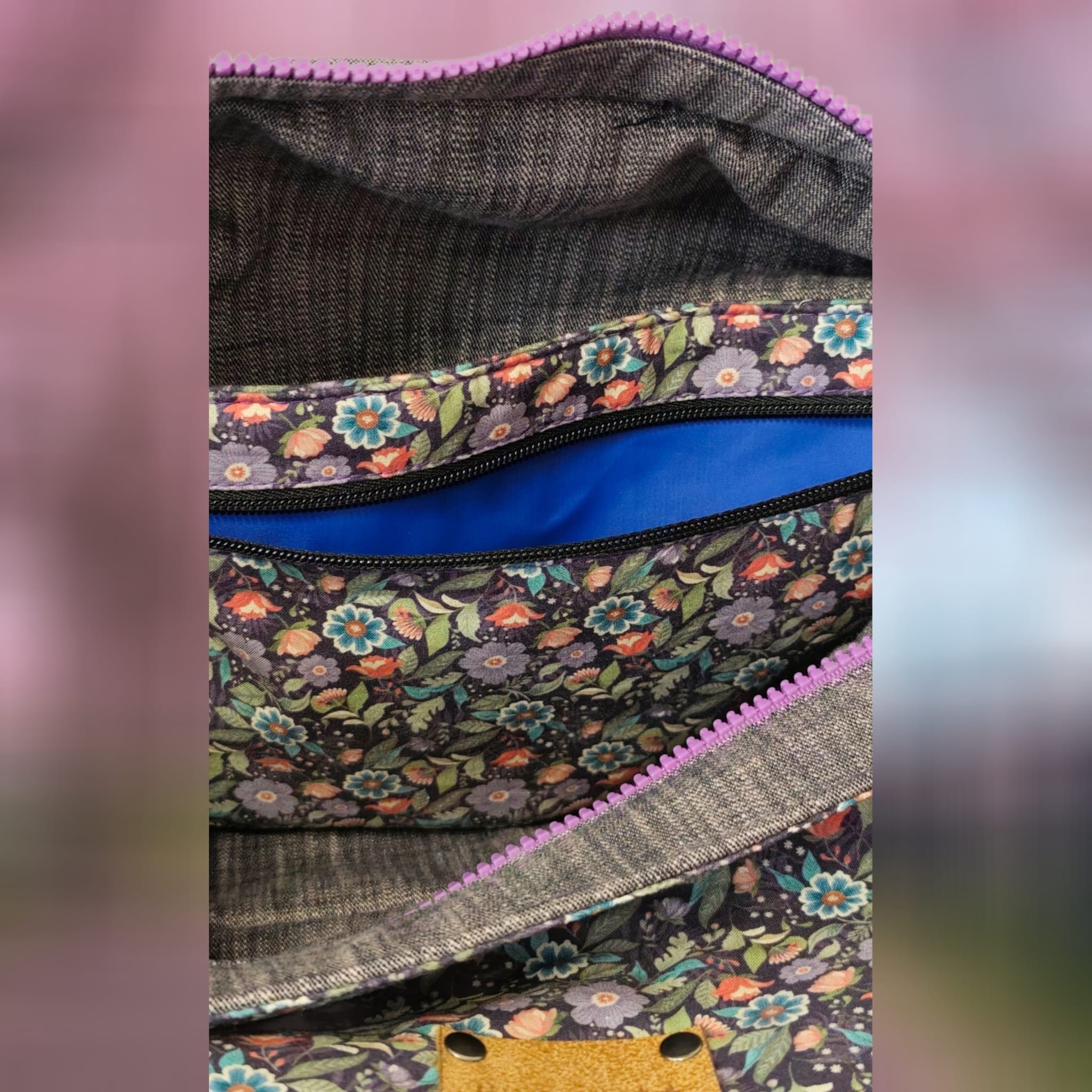 Je vous présente ici un élégant sac cabas printanier, avec fermeture zip. L'extérieur fleuri est en coton fin, la doublure en chambray. Il y a une grande poche intérieure zippée avec une oublure en satin bleu ainsi qu'un mousqueton ( à l'intérieur ).